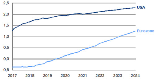 Ein Blick auf die Forward-Kurven zeigt, dass die Finanzmarktakteure mit einem durchschnittlichen Geldmarktzinse von 0,3 % in der Eurozone und von 1,9 % in den USA bis 2024 rechnen. Die durchschnittlichen Kosten einer Währungssicherung für einen europäischen Anleger wären demnach 1,6 % pro Jahr.