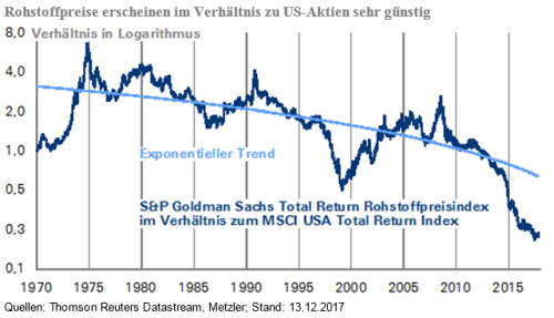 Entweder sind US-Aktien zu teuer oder Rohstoffpreise zu günstig. Sollte das Wachstumstempo der Weltwirtschaft wie allgemein erwartet anhalten, bestehen durchaus Chancen für steigende Rohstoffpreise in 2018.