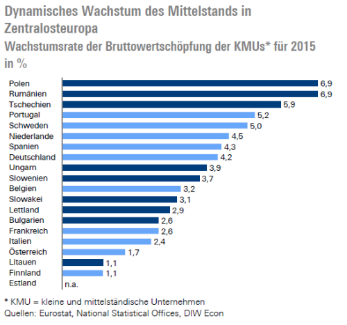 Interessanterweise wird das Wirtschaftswachstum in vielen osteuropäischen Ländern von einem sich dynamisch entwickelnden Mittelstand angetrieben. So entstanden in den vergangenen Jahren zum Beispiel im Umkreis von Universitäten viele innovative IT- und Technologieunternehmen, die oft schon eigenständig und erfolgreich auf den Weltmärkten agieren. Ein Blick auf die Wachstumsraten der Bruttowertschöpfung von Mittelstandsunternehmen für das Jahr 2015 zeigt, dass viele osteuropäische Länder in diesem Bereich zu den Spitzenreitern in Europa zählen.