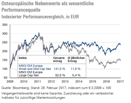 Kleinere und mittlere Unternehmen sind in Osteuropa auch deshalb besonders attraktiv, weil sie nicht wie viele Großunternehmen politischen und regulatorischen Einflüssen unterliegen und weniger anfällig für Korruption sind. Kleinere und mittlere Unternehmen, an denen vielfach noch die Eigentümer Anteile halten, müssen dynamischer als das Management großer Aktiengesellschaften handeln, um erfolgreich bestehen und wachsen zu können. So eröffnen kleinere und mittlere Unternehmen größere Wachstumschancen durch neue Märkte, neue Produkte und niedrige Durchdringungsraten. Die Vorteile einer Investition in mittelständische Unternehmen spiegeln sich unter anderem auch am Aktienmarkt wider. So verzeichnete der Index für kleine und mittelgroße Unternehmen in Osteuropa seit 2009 mehr als die doppelte Wertentwicklung als der vergleichbare Index der großkapitalisierte Unternehmen.