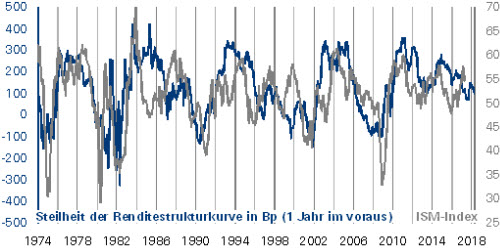 USA: Steilheit der Renditestrukturkurve ist ein zuverlässiger Frühindikator ISM-Index und Steilheit der Renditestrukturkurve* * 10-jährige US-Treasuries minus 3-Monats-Zinsen