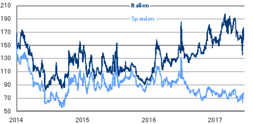 Stuft die Ratingagentur Moody‘s Italien herab? Die CDS-Spreads für Italien haben sich seit 2016 deutlich ausgeweitet – im Gegensatz zu denen in Spanien. Die italienische Wirtschaft lahmt, die Banken ächzen unter einem Berg notleidender Kredite und die Staatsverschuldung ist ungewöhnlich hoch. Nach unseren Berechnungen könnte schon ein Anstieg der Zinsen um 0,8 %-Punkte den italienischen Staat in ernsthafte Bedrängnis bringen. Zumal im kommenden Jahr eine geldpolitische Wende der EZB immer wahrscheinlicher wird. Vor diesem Hintergrund ist es wenig überraschend, dass die Finanzmarktakteure Italien als ein Land unterhalb des Investment-Grades handeln – so das Ergebnis von Modellen, die den CDS-Spread in ein Rating umrechnen. Es besteht somit das Risiko, dass die Rating-Agenturen den Finanzmarktakteuren früher oder später folgen und dass Moody’s Italien am heutigen Freitag von Baa2 auf Baa3 herabstuft.