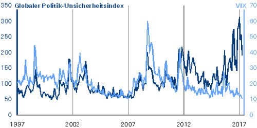 Eine Erklärung dessen könnte sein, dass die Finanzmarktakteure große Probleme haben, aus dem aktuellen politischen Umfeld konkrete Signale und Risiken abzuleiten. Insbesondere die ständigen Kehrtwenden Donald Trumps scheinen für Verwirrung und damit für ein weitestgehendes Ignorieren der politischen Risiken gesorgt zu haben. Es besteht jedoch jederzeit das Risiko, dass sich politische Risiken manifestieren (bspw. Donald Trump tatsächlich Handelsbeschränkungen einführt) und es zu einer erheblichen Kurskorrektur an den Aktienmärkten kommt. Der VIX-Index würde sich dann wieder dem Politik-Unsicherheitsindex annähern.
