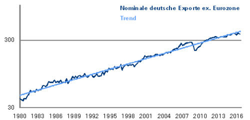Nebenwirkung der expansiven Geldpolitik der EZB: Exportblase in Deutschland? Immer wieder wird die Sorge geäußert, dass die unorthodoxe Geldpolitik der EZB den Euro-Wechselkurs künstlich schwäche, sodass in Deutschland eine Exportblase entstanden sei. Der schwache Euro animiere nämlich die deutschen Unternehmen dazu, neue Exportkapazitäten aufzubauen, die bei einem stärkeren Euro-Wechselkurs nicht mehr konkurrenzfähig sind und damit eine erhebliche Form der Fehlallokation von Kapital sind. Eine Möglichkeit eine Blase zu identifizieren, ist, den aktuellen Wert mit dem langfristigen Trend zu vergleichen. In der unteren Grafik wurden dabei die nominalen deutschen Exporte außerhalb der Eurozone in Logarithmus umgerechnet, um die exponentiell steigenden Exporte in eine lineare Darstellung zu überführen.