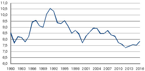 Weltmarktanteil deutscher Exporte bleibt stabil Anteil der deutschen Exporten an den Exporten weltweit in %