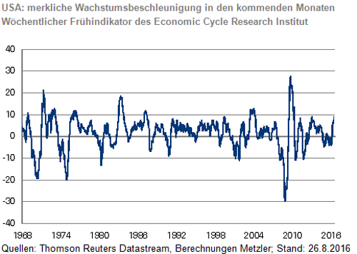 Im Gegensatz dazu blieb der Composite-Einkaufsmanagerindex von Markit im August mehr oder weniger stabil auf niedrigem Niveau. Eine Analyse der Prognosekraft der beiden Einkaufsmanagerindizes seit der Finanzmarktkrise zeigt, dass der Einkaufsmanagerindex von Markit bisher die besseren Signale lieferte. Somit scheint es im August nicht zu einem Wachstumseinbruch der US-Wirtschaft gekommen zu sein, sondern nur zu einer Fortsetzung des schwachen Wachstums seit Jahresanfang. Nichtsdestotrotz bleibt die Unsicherheit über die Wachstumsperspektiven der US-Wirtschaft groß, und der Fokus wird sich daher auf den Philadelphia Fed Index und den Empire State Index (jeweils Donnerstag und für September) richten. Insgesamt überwiegen trotz aller Unsicherheiten die Chancen für eine moderate Wachstumserholung in den kommenden Monaten, wie unter anderem der wöchentliche Frühindikator des Economic Cycle Research Instituts zeigt.