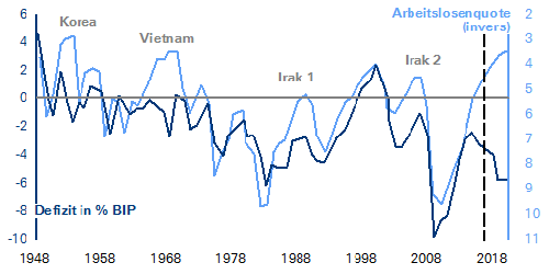 Normalerweise steigt und fällt das Haushaltsdefizit im Einklang mit dem Konjunkturzyklus. So war in den USA bis vor kurzem eine hohe Korrelation zwischen der Entwicklung des Haushaltsdefizits und der Arbeitslosenquote zu beobachten: Eine sinkende Arbeitslosenquote ging einher mit einem sinkenden Haushaltsdefizit. Nur während militärischer Konflikte koppelte sich das Haushaltsdefizit temporär vom Konjunkturzyklus ab.