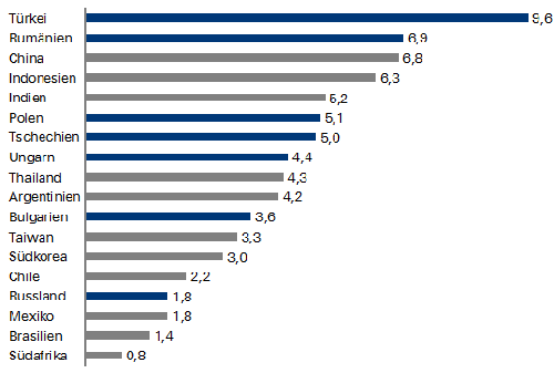 Auffällig ist dabei die Türkei mit einem Wirtschaftswachstum von 9,6 % im dritten Quartal. Ein Grund für das starke Wachstum ist ein Basiseffekt: Der Putschversuch im dritten Quartal 2016 hatte negative Folgen für Tourismus und die Wirtschaft im Allgemeinen. Darüber hinaus verfolgte die türkische Regierung 2017 eine sehr expansive Fiskalpolitik. Sie senkte die Steuern und gab den Banken umfangreiche Kreditgarantien. Die Banken mussten somit für neue Kredite kein Eigenkapital hinterlegen und expandierten die Kreditvergabe 2016 von einer Wachstumsrate von noch 12 % auf eine Wachstumsrate von ca. 25 % im Jahr 2017.
