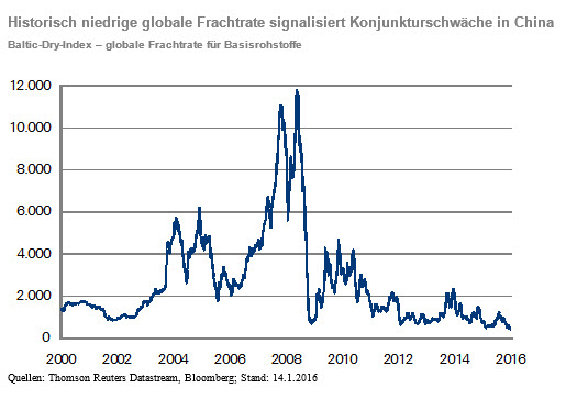 Der merkliche Rückgang der Industriemetallpreise und der Einbruch der globalen Frachtrate für den Schiffstransport von Basisrohstoffen könnten ein Anzeichen dafür sein, dass die chinesische Wirtschaft als weltweit wichtigster Nachfrager nach Rohstoffen im Industrie- und im Bausektor mit erheblichen Wachstumsproblemen zu kämpfen hat. So fiel die globale Frachtrate für Basisrohstoffe zuletzt auf einen historischen Tiefstand.