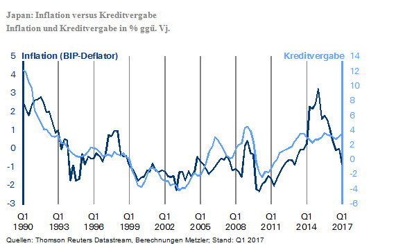 Eine interessante Sichtweise der Deflation in Japan ist, dass sie sich als eine Spätfolge der Finanzmarktkrise erklären lässt. So ächzte der japanische Bankensektor von 1990 bis 2003 unter einem Berg an notleidenden Krediten auf seiner Bilanz, der eine Vergabe neuer Kredite nahezu unmöglich machte. Dementsprechend kollabierte das Wachstum der Kredite von etwa 12 % im ersten Quartal 1990 bis auf -4,2 % im zweiten Quartal 2003. Da die Banken durch die Vergabe von Krediten frisches Geld schöpfen und damit die Inflation maßgeblich beeinflussen, konnte seinerzeit aufgrund der schrumpfenden Kreditvergabe in Japan eine Deflation entstehen.
