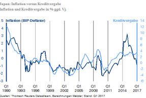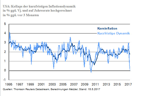 Zuletzt überraschten die Inflationsdaten weltweit durch ihre Schwäche. So fiel beispielsweise die Kerninflation in den USA im Mai auf nur noch 0,0 % (Jahresrate) über die vergangenen drei Monate, während sie in den drei Monaten bis Februar 2017 noch um eine Jahresrate von 3 % gestiegen war.