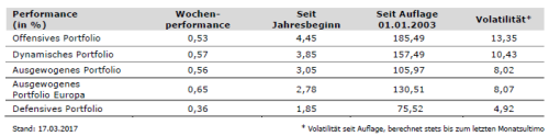 In der vergangenen Handelswoche konnten alle Portfolios eine positive Entwicklung verbuchen. Die aktienlastigeren Strategien entwickelten sich dabei besser. Die Beimischung von Unternehmensanleihen (Unternehmensanleihen mit Investment-Grade-Rating) konnte gegenüber Euroland-Staatsanleihen auf der Rentenseite einen Mehrwert liefern. Anleihen aus den Schwellenländern entwickelten sich abermals besser. Auf der Aktienseite brachte die Beimischung der Emerging Markets ebenfalls klare Vorteile. Auf Sektorebene konnten die Übergewichtung des ITSektors und der Growth-Bias einen spürbaren Zusatzertrag generieren.