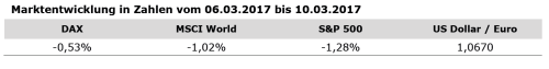 Bei der Pressekonferenz wurden zwar Verbesserungen bei der Investitionsnachfrage und eine gestiegene Inflationsrate angeführt, jedoch werde weiterhin eine moderate geldpolitische Straffung verfolgt. Für das laufende und das kommende Jahr zeigt der Median bei den FOMC-Mitgliedern jeweils drei Zinserhöhungen von 25 Basispunkten an. In den USA zeigten sich die Umfragewerte für März beim Philly Fed Index und dem Empire State Index trotz Rückgang freundlich. Nachdem beide Werte in den vergangenen Monaten stark angestiegen waren, kam es nun zu einem technischen Rücksetzer. In Deutschland stieg die ZEWLagebeurteilung auf 77,3 Punkte weiter an. Bei den ZEW-Konjunkturerwartungen kam es ebenfalls zu einem leichten Anstieg auf 12,8 Punkte. Die geringe Aufwärtsbewegung zeigt die derzeitige Unsicherheit über die weitere Entwicklung der Konjunktur an. Gerade die bevorstehenden Wahlen in einigen EU-Ländern und die damit verbundenen politischen Risiken halten die Unsicherheit für die deutsche Wirtschaft weiter auf einem relativ hohen Niveau.