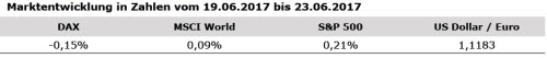 Die vergangene Woche war eher nachrichtenarm. In der zweiten Runde der französischen Parlamentswahlen konnte Emmanuel Macrons Partei, La République en Marche, die absolute Mehrheit in der Nationalversammlung erreichen. Der Europabefürworter und seine Partei können so ihre Reformpläne umsetzen, ohne auf Stimmen anderer Parteien angewiesen zu sein. Die Entspannung der politischen Lage in Frankreich trägt weiter zum positiven konjunkturellen Umfeld der Eurozone bei. Der Einkaufsmanagerindex (PMI) der Industrie stieg in Europa auf ein neues Sieben-Jahres-Hoch von 57,3 Punkten (Konsensschätzung 56,8). Einzig in der deutschen Industrie macht sich etwas Höhenangst bemerkbar. Hier fiel der Einkaufsmanagerindex um 0,2 Punkte auf einen Stand von 59,3 Punkten. Nachdem der Einkaufsmanagerindex für den Dienstleistungssektor der Eurozone im Vormonat stark gestiegen war, musste dieser bei einem Konsensus von 56,4 Punkten eine Korrektur auf 54,7 Punkte hinnehmen. Der US-Datenkalender indes war schwach bestückt. Daten für den US-Konsum und die Industrieproduktion werden erst diese Woche erwartet.