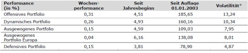 In der letzten Handelswoche konnten alle Portfolios eine positive Wertentwicklung aufweisen. Auf der Aktienseite war dabei die Übergewichtung des US-amerikanischen Aktienmarktes von Vorteil, wobei die dortige Übergewichtung von Small und Mid Caps zusätzlich unterstützte. Auf der Rentenseite erwiesen sich dabei die kurze Durationspositionierung, die Beimischung von Unternehmensanleihen (High Yield und Investment Grade Corporates) und Engagements in Anleihen aus den Schwellenländern als Nachteil. Das Engagement in den Schwellenländern erwies sich dagegen als Übergewichtung von Technologie- und Gesundheitsaktien positive Auswirkungen.