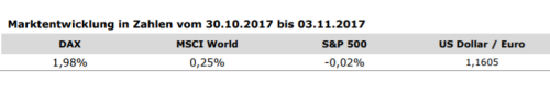 In der Eurozone zeigte sich das BIP-Wachstum im dritten Quartal anhaltend freundlich. Gemäß der ersten offiziellen Schätzung lag der Zuwachs mit 0,6 Prozent gegenüber dem Vorquartal über den Erwartungen. Trotz der sehr guten Stimmung und dem wirtschaftlichen Aufschwung kommt die Inflation auf europäischer Ebene jedoch nicht so richtig in Schwung. Die Konsumentenpreise stiegen im Oktober lediglich um 1,4 Prozent, während die Kerninflation mit einer Veränderung von 0,9 Prozent gegenüber dem Vormonat deutlich absackte. Der Arbeitsmarktbericht in den USA blieb in der vergangenen Handelswoche wieder hinter der Konsensschätzung. Entgegen den Erwartungen von 310.000 neugeschaffenen Stellen wurden lediglich 261.000 erreicht. Jedoch wurden die beiden Vormonatswerte klar erhöht, was insgesamt dazu führte, dass die Arbeitslosenquote im Oktober mit 4,1 Prozent den niedrigsten Stand in 17 Jahren erreichte. Der ISM-Einkaufsmanagerindex im Dienstleistungsbereich kletterte indes mit 60,1 nach 59,8 Punkten auf einen neuen 12- jährigen Rekordwert. Der Wert im verarbeitenden Gewerbe musste zwar einen Rücksetzer hinnehmen, verblieb mit 58,7 Punkten aber ebenfalls auf einem sehr hohen Niveau. Bei der geldpolitischen Entscheidung der US-Notenbank kam es dieses Mal zu keinen Veränderungen. Für die Dezembersitzung wird jedoch mit einem nächsten Zinsschritt gerechnet.