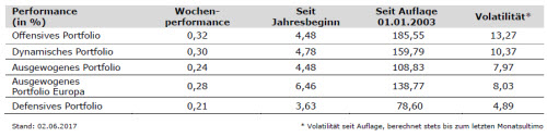 In der vergangenen Handelswoche konnte das Private Wealth Portfolio um 0,20 Prozent zulegen. In einem uneinheitlichen Umfeld konnten besonders die Fonds auf der Aktienseite für einen Mehrwert sorgen. Dazu zählen u.a. der Legg Mason MC Eurp Abs Alpha (+1,20%), 4Q-EUROPEAN OPPORTUNITIES (+1,04%) und DNB Technology (+0,87%). Aufgrund des schwachen US Dollars (-0,81%) musste hingegen der Nordea 1 - US Total Return Bond (-0,61%) insgesamt einen Verlust verkraften. Auch das negative Ergebnis bei den Emerging Markets (MSCI EM -0,93%) wirkte sich nachteilig auf den Robeco QI Emerging Cnsrv Eqs (-0,43%) aus.