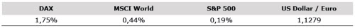 Der Preis für ein Barrel Öl der Sorte Brent fiel um über zwei US-Dollar auf 49,95 Dollar. Bei den Währungen legte der Euro gegenüber dem US-Dollar weiter etwas zu und notiert nun bei 1,13 EUR/USD. Der japanische Yen konnte gegenüber dem Euro im Laufe der letzten Woche etwas an Wert gewinnen.