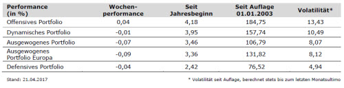 Mit Ausnahme des offensiven Portfolios mussten in der vergangenen Handelswoche die Portfolios eine negative Entwicklung verkraften. Auf der Rentenseite brachte die kurze Durationspositionierung leichte Vorteile. Die Beimischungen von Unternehmensanleihen (Hochzinsanleihen) konnten gegenüber Euroland-Staatsanleihen wieder einen klaren Mehrwert liefern. Anleihen aus den Schwellenländern und US-Staatsanleihen entwickelten sich ebenfalls besser als Euroland- Staatsanleihen. Auch auf der Aktienseite trug die Beimischung der Emerging Markets negativ bei. Auf Sektorebene war die Übergewichtung des IT-Sektors positiv.