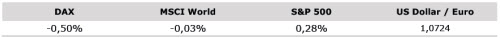 Im Rentenbereich entwickelten sich Hochzinsanleihen am besten, gefolgt von Staatsanleihen und Unternehmensanleihen mit Investment-Grade-Rating. Anleihen aus den Emerging Markets schnitten gegenüber Euroland-Staatsanleihen deutlich besser ab.