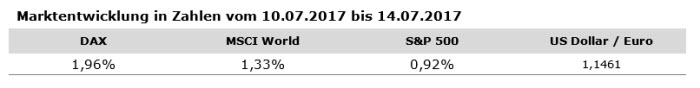 In den USA stehen die Vorzeichen weiter auf Wachstum – wenn auch mit kleinen Schönheitsfehlern. Die Industrieproduktion legte gegenüber dem Vormonat um 0,4 Prozent zu, während die Konsumausgaben allerdings hinter den Erwartungen zurückblieben und die zuletzt erfreuliche Entwicklung auf dem Arbeitsmarkt nicht widerspiegeln. Die Einzelhandelsumsätze (sowohl mit als auch ohne Autos) fielen um 0,2 Prozent gegenüber dem Vormonat. Dass die Amerikaner im Moment weniger Geld für den Konsum ausgeben zeigte auch der um 1,9 auf 93,1 Punkte gefallene Verbraucherstimmungs-index der University of Michigan. Nicht verwunderlich ist, dass sich dieses Kaufkraftverhalten negativ auf die Inflation auswirkt. Der Verbraucherpreisindex notiert nur 1,6 Prozent über dem Vorjahresstand, was der geringsten Teuerung seit acht Monaten entspricht. Eine schwache Inflation spricht tendenziell gegen eine straffere Geldpolitik und Janet Yellen sieht die Inflation auch als größten Unsicherheitsfaktor mit Blick auf die künftige geldpolitische Entwicklung. Die FED-Chefin hält die US-Wirtschaft aber dennoch für stark genug, um weiter an der graduellen Zinserhöhung festzuhalten. In der Eurozone gewinnt die Konjunktur weiter an Fahrt. Unbeeindruckt vom zuletzt stärkeren Euro stieg der Handelsüberschuss für Güter und Dienstleistungen weiter an, auf derzeit 21,5 Mrd. Euro. Die Industrieproduktion lag mit einem Plus von vier Prozent gegenüber dem Vorjahr deutlich über den Erwartungen.
