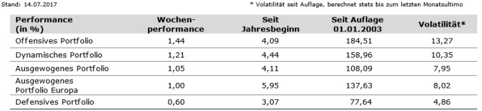 In der vergangenen Handelswoche konnten alle Portfolios deutlich zulegen. Als klarer Performancetreiber erwies sich die Aktienseite. Dabei sorgte besonders die Übergewichtung von Emerging Markets-Titeln für eine erfreuliche Outperformance. Auch das kürzlich aufgebaute Exposure zu Osteuropa konnte einen Mehrwert generieren. Zudem erwies sich das Übergewicht in „Small-Caps“ und dem Technologiesektor als vorteilhaft. Auf der Rentenseite war die kurze Durationspositionierung von Nachteil. Das Engagement in Unternehmens- und High-Yield-Anleihen lieferte hingegen einen Mehrwert.