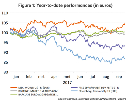 The reflation trade gained further traction supported by an improvement of the macro data, and also by somewhat higher bond yields as rumours about one of Yellen’s potential successors sparked some nervousness in the bond market. Equities were the best performing asset class, gaining more than 2% over the week. Some weakness in the euro was also helpful. Politics played an important role with difficult negotiations ahead in Germany, the chaotic Catalonian referendum and hope of a US tax plan. In the meantime, the war of words between the US and North Korea seems to have cooled down a bit.