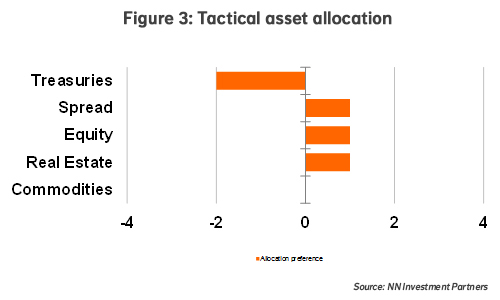 We currently have a medium underweight Treasuries and small overweights in equities, real estate and fixed income spreads. This allocation combines exposure to the reflation trade with exposure to the search for yield.