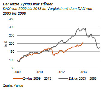 Und noch eines: Der Aktienaufschwung ist etwa so lang wie die beiden vorhergehenden Hausse-Phasen. Die Grafik zeigt, wie es 2008 nach fünf Jahren Kurssteigerungen mit einem Mal kräftig nach unten ging. Dazu trug freilich auch die Lehman-Pleite bei. Ohne sie wäre der Aufschwung vermutlich noch weitergegangen.