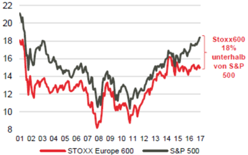 Europa, und insbesondere die Eurozone, sehen wir als beste Option für Aktienanleger. Hier feuert die Wirtschaft in Deutschland auf allen Zylindern und ist zumindest in einigen der südeuropäischen Nachzügler auf Erholungskurs. Indikatoren zu Verbrauchervertrauen und Geschäftsklima tendieren nach oben. Auch die Industrieproduktion zieht an. Ein besonders schlagendes Argument für den Kauf europäischer Aktien ist jedoch ihre Bewertung. Mit den in den letzten drei Jahren boomenden US-Aktienmärkten konnte Europa nicht Schritt halten. In 2017 ist dieser Abstand noch gewachsen, abzulesen am KGV im Stoxx Europe 600, das aktuell 18% niedriger ist als im entsprechenden US-Index, dem S&P 500. Zudem bieten in Europa Aktien gegenwärtig im Durchschnitt eine im Vergleich zur Anleiherendite höhere Dividendenrendite. Da der durchschnittliche Gewinn je Aktie am europäischen Aktienmarkt aktuell 15% unter dem Niveau von 2007 liegt, ist noch viel Luft nach oben.