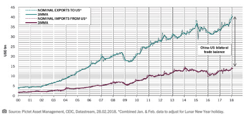 The gap between China’s nominal exports and imports to the US is the largest ever, as Fig.1. below shows. This is the argument used by President Donald Trump for raising import tariffs on Chinese goods.