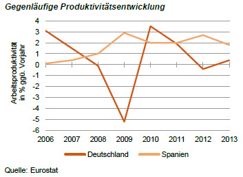 Schließlich verliert Deutschland an Wettbewerbsfähigkeit. Das zeigt sich nicht so sehr im Export, weil die Produktion dieser Güter vielfach schon nicht mehr in Deutschland stattfindet. Es wirkt sich jedoch auf die Wirtschaftskraft innerhalb der Europäischen Gemeinschaft aus. Die Grafik zeigt den Vergleich der Entwicklung in Deutschland mit der in Spanien. Seit dem Beginn der Wirtschafts- und Finanzkrise und ganz besonders seit der Eskalation der Eurokrise hat sich die Produktivitätsentwicklung in Spanien anders als in Deutschland deutlich beschleunigt. Im letzten Jahr erhöhte sie sich um 2,4 %.