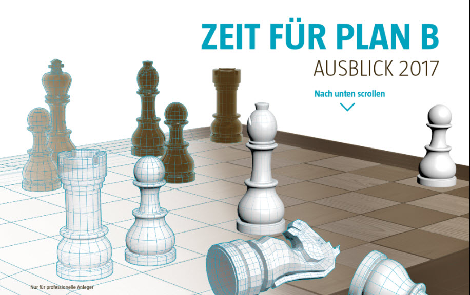 In diesem Jahr haben wir mit einer Tradition gebrochen und unseren Blick in die nahe Zukunft als dynamische Infografik erstellt. Als Titel dafür haben wir angesichts der turbulenten Veränderungen in 2016 „Zeit für Plan B” gewählt. In unserem Ausblick 2017 befassen wir uns mit über einem Dutzend Themen, darunter die US-Wirtschaft, Europas ‚Problemkinder’ Italien und Großbritannien, China, die Schwellenländer und das Bewertungsniveau von Aktien auf der ganzen Welt.