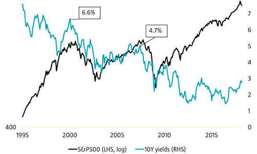 „Alternativ kann man sich auch ansehen, wie hoch die Renditen auf Treasuries waren, wenn eine Aktienmarkt-Rally ins Stocken geriet. In den Jahren 1998-2000 kletterte die Rendite auf 10-jährige Treasuries von einem Ausgangsniveau von ca. 4 Prozent auf über 6 Prozent, bevor die Aktienkurse nachgaben. 2008 bewegten sich die Renditen in einer Bandbreite von 4,5-5 Prozent, als die Korrektur am Aktienmarkt ernsthaft begann. Damals galt eine Rendite von 3 Prozent als unhaltbar niedrig und wurde sicher nicht als ein Hindernis für Aktien angesehen.”