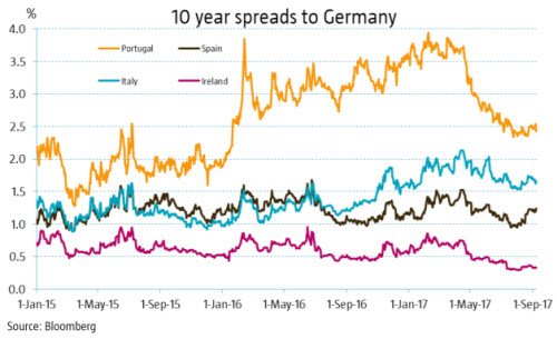 Italian spreads tightened a bit, while Spanish spreads rose somewhat this week. After the ECB meeting all peripheral spreads tightened. He also suggested that an announcement on both the length and the size of QE would be made at the next ECB meeting in October. Italian bonds have returned 0.82% this year, Spanish bonds 1.39%, Portuguese bonds 8.82% and Irish bonds 0.67%.