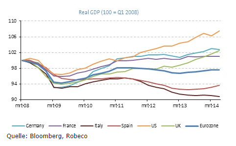 Während die US-Notenbank Fed ihr Programm zum Ankauf von US-Staatsanleihen und Mortgage-Backed Securities (durch Pools von Hypothekendarlehen unterlegte Wertpapiere) weitgehend abgeschlossen hat, wird die EZB mit dem Kauf von Asset-Backed Securities (forderungsbesicherte Wertpapiere) und gedeckten Schuldverschreibungen am offenen Markt beginnen. Dies macht deutlich, dass sich die USA und die Eurozone in unterschiedlichen Phasen des Konjunkturzyklus befinden. Während sich die US-Wirtschaft allmählich erholt, scheint die Wirtschaft der Eurozone zu stagnieren. Die unten stehende Grafik zeigt die unterschiedliche wirtschaftliche Dynamik einzelner Länder. Am vorderen Ende der US-Zinsstrukturkurve halten wir eine Position mit kurzer Duration aufrecht; denn unserer Meinung nach sind die Märkte im Hinblick auf die zukünftige Geldpolitik der Fed zu selbstzufrieden. Wesentlich wohler fühlen wir uns mit Engagements in Zinspapieren aus der Eurozone, auch wenn Anleihen mit kurzer Laufzeit, deren Renditen fast bei null liegen, kein Wertpotenzial bieten.