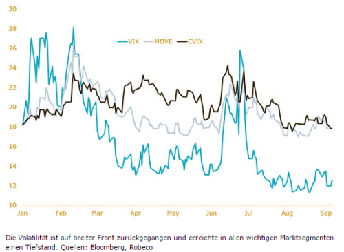 „Im August war die Volatilität so niedrig wie in bisher keinem anderen Monat im laufenden Jahr”, sagt Daalder, der Chief Investment Officer von Robeco Investment Solutions. „Interessanterweise galt das für alle wichtigen Anlageklassen. So erreichten der VIX (er misst die in Derivaten auf den US-Aktienmarkt implizierte Volatilität), der MOVE (er tut dasselbe in Bezug auf US-Anleihen) und sogar der CVIX (der sich auf Währungsschwankungen bezieht) alle ihren Jahrestiefstand Anfang August.”