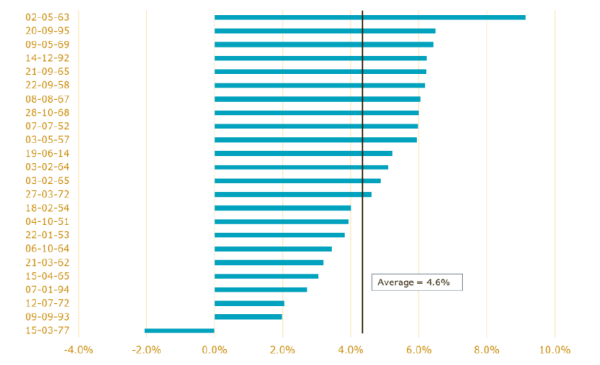Laut Daalder zeigen sich beim S&P 500 Index seit 1930 insgesamt 24 Zeiträume, in denen die Volatilität für mindestens zwei Monate niedrig blieb. In diesen Phasen stiegendie Aktienkurse im Schnitt um 4,6 Prozent (siehe folgende Grafik).