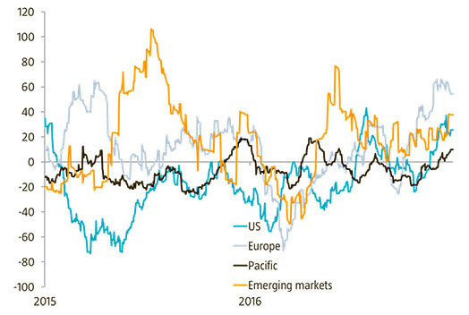 „Entweder sind die Aktienkurse bereits über ihr Ziel hinausgeschossen oder die Top-down-Konsensauffassung zu den Wachstumserwartungen ist immer noch recht konservativ. Ein größeres Risiko scheint die eindeutig ungenügende Beachtung zu sein, die den potenziellen negativen Auswirkungen einer ‚Ent-Globalisierung’ geschenkt wird: Von der Annahme, dass die Vernunft die Oberhand behalten wird, sind wir angesichts von Trumps Charakter nicht sonderlich überzeugt.”