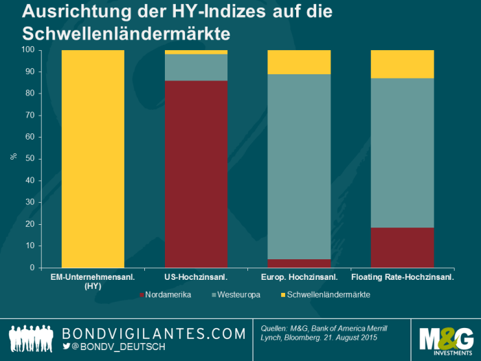 Um die Auswirkungen zu beurteilen, klären wir zunächst einmal die Frage, welches Volumen direkt betroffen ist. Gemeint ist damit jener Anteil des Marktes, der in den Schwellenländern zu Hause ist (d.h. all jene Unternehmen, die unter Umständen gleich doppelt leiden, nämlich unter einem langsameren Wachstum einerseits und einer sinkenden Währung andererseits) bzw. der Teil des Marktes, der im Rohstoffsektor tätig ist (also die Emittenten aus dem Energie-, Bergbau- und Stahlsektor). Als nächstes wenden wir uns dann dem indirekt betroffenen Volumen zu – oder anders gesagt wir überprüfen, wie anfällig die unterschiedlichen Hochzinsmärkte wegen ihrer Duration, ihrer Bonitäten und ihrer Kapitalstruktur auf eine generellere Neubewertung von Risiken reagieren könnten. Um dabei nicht allzu sehr ausschweifen zu müssen, werde ich vier breit gefasste (von der Bank of America Merrill Lynch veröffentlichte) Indizes verwenden: den US High Yield-Index, den European Currency High Yield-Index, den High Yield Emerging Markets Corporate Plus-Index (ein Hartwährungsindex) sowie den Global Floating Rate High Yield-Index. Damit erhebe ich keinesfalls Anspruch auf Vollständigkeit, und es bestehen andererseits auch Überschneidungen zwischen diesen Indizes, sie scheinen uns aber geeignet, die Hochzinsmärkte in den USA und Europa sowie die Hochzinsmärkte in harten Schwellenländerwährungen und mit variabler Verzinsung zumindest einigermaßen exakt abzubilden.