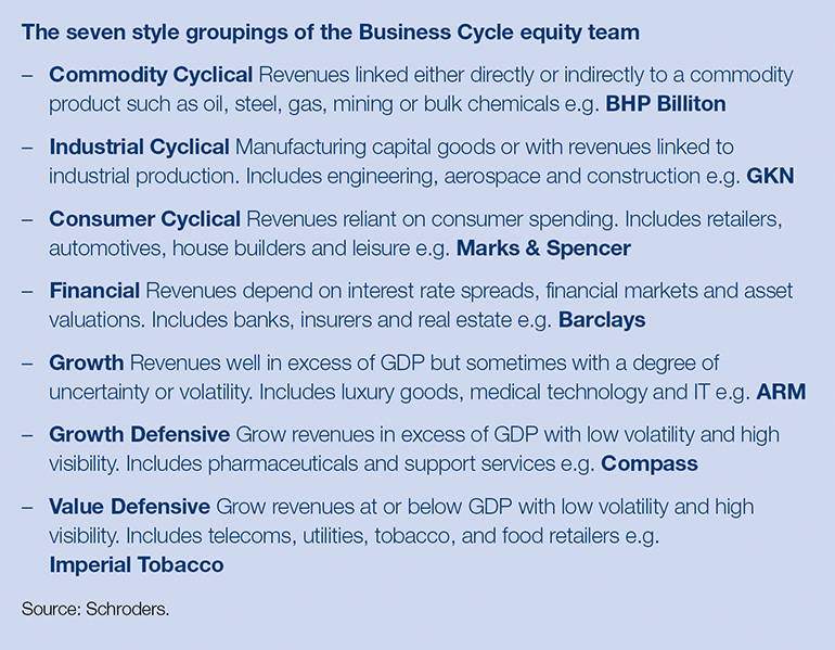 Supportive monetary policy, with analysts and investors expecting continued policy intervention in the eurozone and Japan, should help to stave off deflation. Indeed the deflationary fears have driven ‘gilt proxies’ (such as many of the utility companies found within Value Defensives, one of the seven style groupings followed by the Business Cycle equity team - see below) and they are now fully valued for their expected earnings growth and in the main we have limited exposure to this area.
