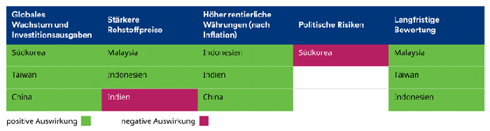 Die weltweit vorherrschenden fundamentalen Faktoren, die wir oben aufgeführt haben, werden den Mittelzuflüssen in auf Lokalwährung lautende Schwellenländeranleihen zugute kommen. Das gilt insbesondere für Länder mit höheren realen Renditen, beispielsweise Indien, Indonesien, China und Malaysia. Wir gehen davon aus, dass die Anleihemärkte der stärker entwickelten Länder nur leicht besser abschneiden werden als die US-Anleihemärkte. Anleihen aus Taiwan, Hongkong und Südkorea dürften eher in einer engen Bewertungsspanne verharren.