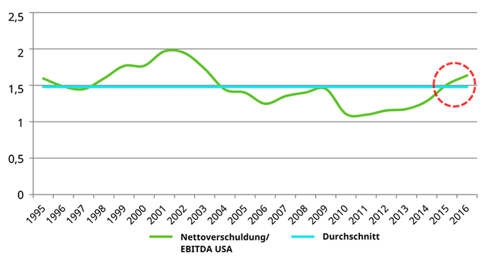 Bemerkenswert ist zum Beispiel, dass derzeit, anders als bei früheren Markthöchstständen, die Verschuldung außerhalb des Finanzsektors als wesentliche Finanzkennzahl in den USA „rot aufleuchtet“. Anstatt in neue Investitionsgüter zu investieren, haben viele US-Unternehmen Schulden aufgenommen, um Aktienrückkäufe und/oder Dividendenerhöhungen vorzunehmen: Das hilft zwar den Aktienkursen, ist jedoch mittelfristig gerade aufgrund steigender Zinsen nicht nachhaltig.