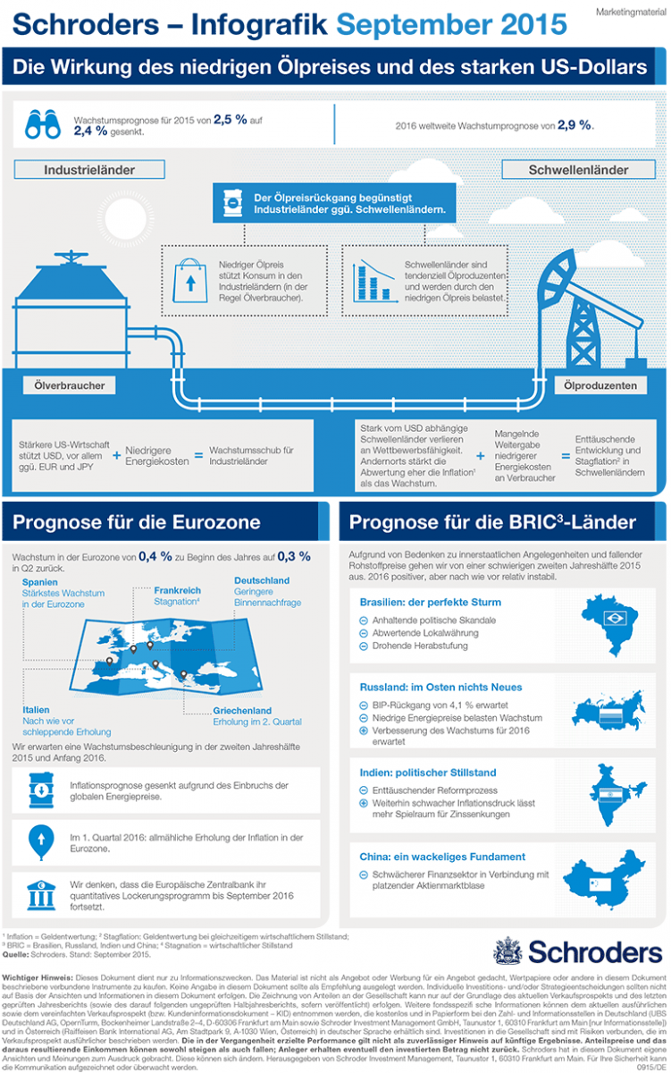 In der September-Infografik beleuchten unsere Anlageexperten die Effekte des niedrigen Ölpreises und des starken US-Dollars auf die Weltwirtschaft und geben ein Update zu ihren Wachstumserwartungen für die Eurozone und die BRIC-Staaten.