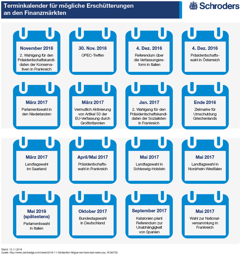 Der Erfolg von Trump bei der Wahl in den USA ist ein weiterer Beweis für den zunehmenden Populismus auf Wählerseite. Wie bei der Entscheidung Großbritanniens für den Ausstieg aus der EU sind die Folgen der US-Wahl nur schwer einschätzbar, ehe nicht eine feste politische Linie bekanntgegeben wird. Die allgemeinere Sorge für Anleger besteht darin, dass das Wahlergebnis die antieuropäische Stimmung in ganz Europa schüren und damit das komplette europäische Projekt gefährden könnte. Und damit bleibt ein großes Fragezeichen, was die globalen Wirtschaftsbedingungen anbelangt.