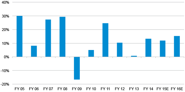 The most significant driver for earnings growth over the medium term is operating leverage. Current low capacity utilisation levels will allow companies to take advantage of any demand revival through existing capacity, thus providing high marginal profitability of incremental demand. As economic growth picks up, a meaningful demand revival is expected towards the end of 2015 and once this happens it will give a further large boost to earnings.