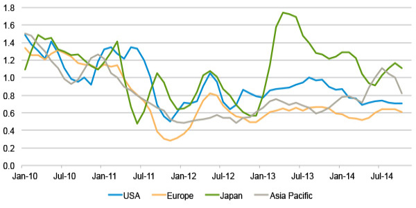 We are more constructive about Japanese equities relative to the European market. Japanese Prime Minister Abe’s recent decision to delay the second consumption tax increase will be supportive for the economy and for domestic equity buyers while improved corporate governance is likely to attract more foreign equity buyers. Furthermore, corporate tax cuts over the next few years will boost companies’ earnings. In Europe, companies have managed to post good results but this has largely been on the back of extensive cost-cutting measures while actual revenue growth has been negligible. But overall, the softer European economy is likely to weigh on the market in 2015 and curtail the ability of European companies to generate meaningful earnings growth.
