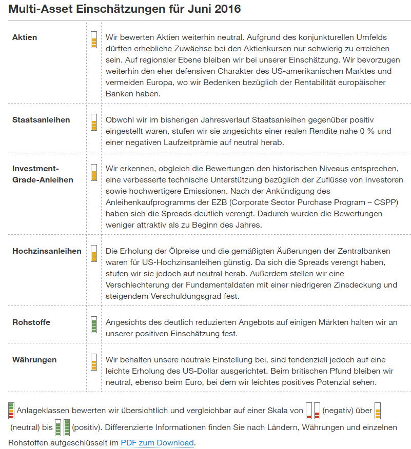 Sichtweisen und Einschätzungen zu Aktien, Staats- und Unternehmensanleihen sowie zu Rohstoffen und Währungen: Jeden Monat schätzt das Multi-Asset-Team von Schroders die wichtigsten Anlageklassen ein.