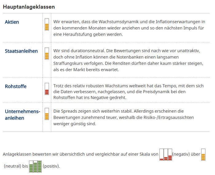 Angesichts der relativ ambitionierten Bewertungsniveaus sind wir gegenüber vielen Anlageklassen neutral eingestellt. Bei Rohstoffen haben sich die Aussichten ins Negative verschoben.