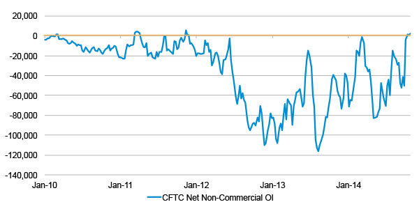 Since 2011 onwards, many investment banks and hedge fund strategies extracted a carry from the curvature of the volatility curve by selling short maturity and buying longer maturity contracts. This has led to “Non-Commercials” historically being net short VIX futures. However, we see that in October these short positions were closed for the first time since 2011. Many of these strategies have suffered negative returns since 2013 and holders may have finally closed out of their positions after the recent equity correction in October.